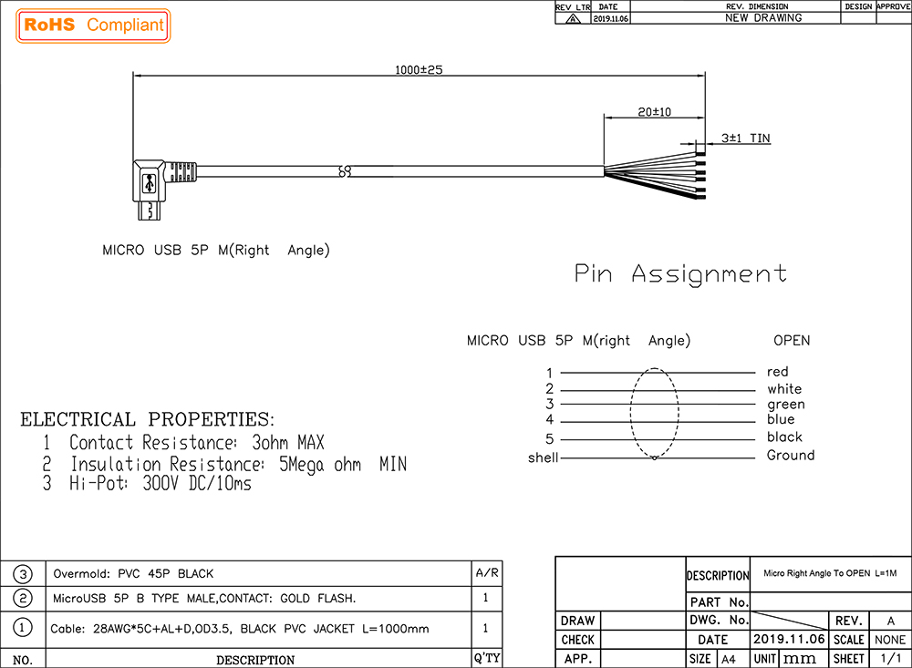 1.1 Item Name: 5 wires 5pin Right angle micro usb to open cable